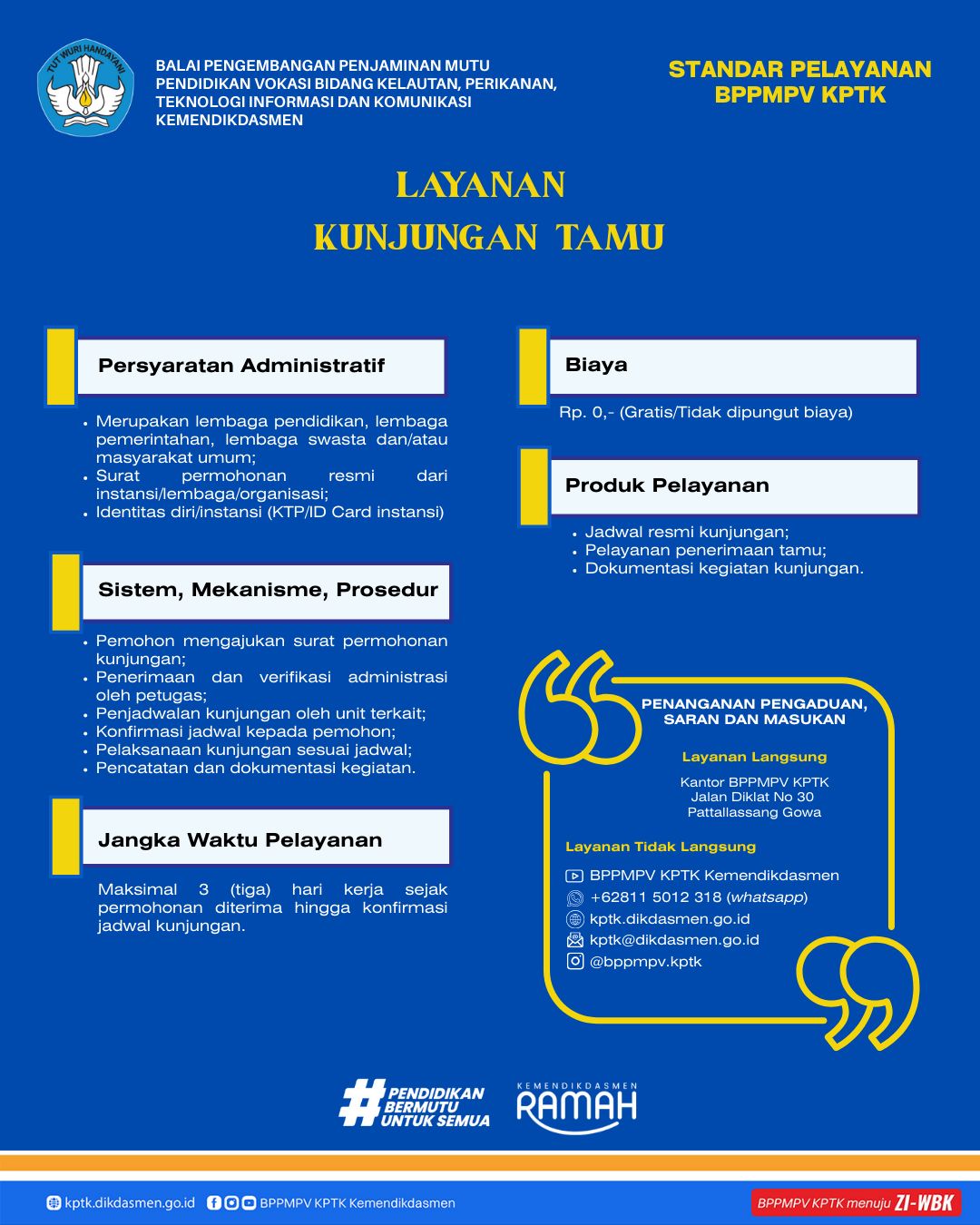 Layanan Kunjungan Tamu di BPPMPV KPTK ditujukan bagi masyarakat, lembaga pendidikan, instansi pemerintah, maupun mitra industri yang ingin memperoleh informasi langsung mengenai program, fasilitas, dan layanan yang dimiliki. Melalui layanan ini, pengunjung dapat melakukan studi banding, observasi, konsultasi, ataupun menjalin kerja sama dalam rangka pengembangan pendidikan vokasi di bidang Kelautan, Perikanan, serta Teknologi Informasi dan Komunikasi.