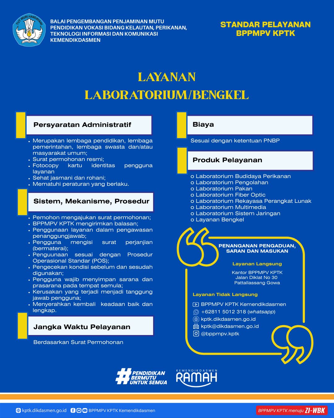 Layanan Penggunaan Fasilitas dan Akomodasi Kantor di BPPMPV KPTK memungkinkan masyarakat, lembaga, maupun mitra kerja untuk memanfaatkan berbagai sarana yang tersedia sesuai ketentuan yang berlaku. Fasilitas yang dapat digunakan meliputi aula, ruang pertemuan, laboratorium, sarana praktik, hingga asrama, yang dapat mendukung penyelenggaraan kegiatan pendidikan, pelatihan, penelitian, maupun acara lain sesuai kebutuhan pemohon.